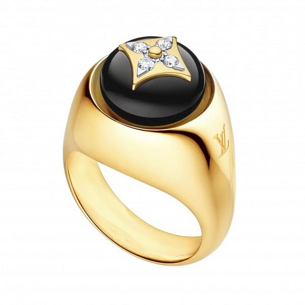 lingyizujiezhimofanggudianfenggedeyinzhangjiezhi(signet ring)——jiebichengcuguangdekuanbianlunkuo,cemiankeyou monogram tutengzhongde“lv”biaozhi;jiemianzhongyangtuoqiyikehumianbaoshihuojinzhu,rutongfudongyujiemianzhishang,dingbudesijiaoxinghuawenchengweiyinrenzhuyidejiaodian。zheiyiqiaomiaodefudongjiegoutongyangyunyongyub. blossom shouzhuodeshejizhong。