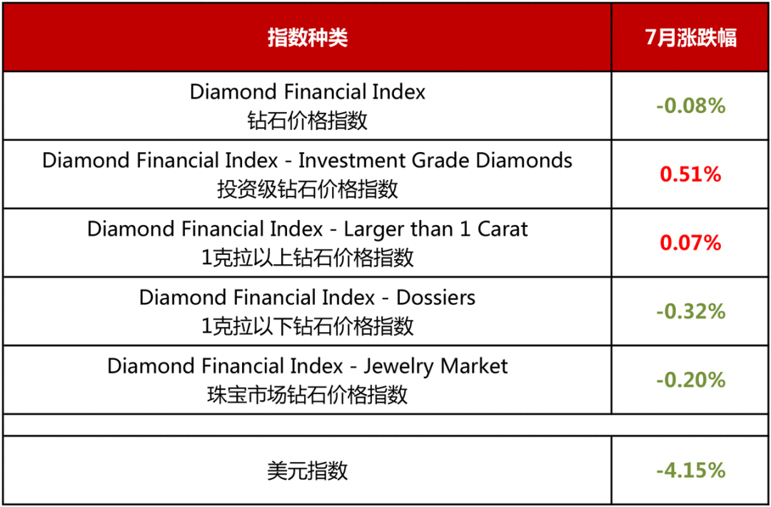 2020nian7yue,zuanshijiagezongzhishu(diamond financial index)7yueleijixiadie0.08%,touzijizuanshijiagezhishu( investment grade diamonds)shangzhang0.51%,1kelayishangzuanshijiagejiagezhishu(larger than 1 carat)shangzhang0.07%,1kelayixiazuanshijiagezhishu( dossiers)xiadie0.32%。