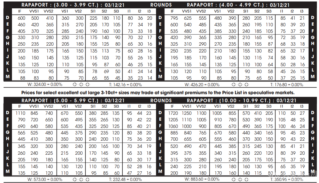 2021年3月12日最新Rapaport钻石报价表(图文)