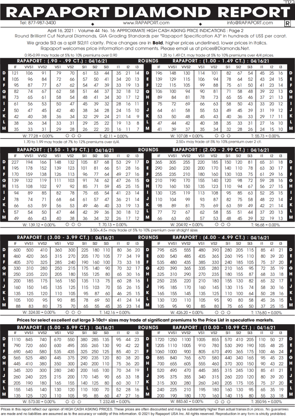 Rapaport钻石报价表(简称国际钻石报价表)是钻石批发商交易钻石时的重要价格依据,为钻石商家提供有效的国际钻石价格参考,消费者可根据报告全面了解最新钻石价格。下面分享2021年4月16日最新Rapaport国际钻石报价单图文介绍。