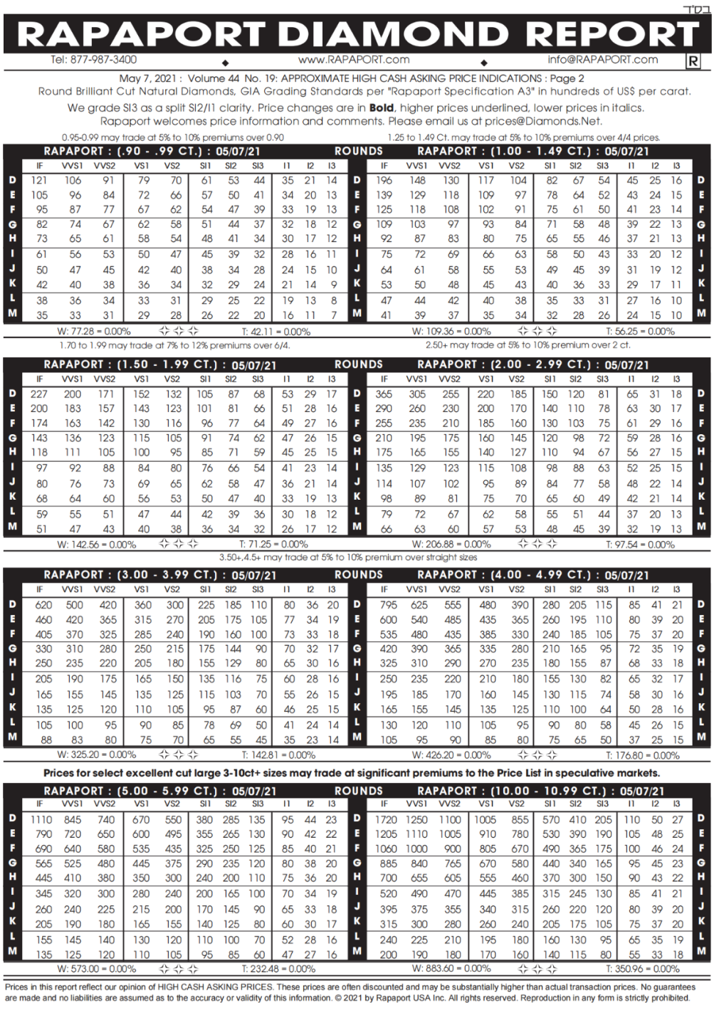 Rapaport钻石报价表(简称国际钻石报价表)是钻石批发商交易钻石时的重要价格依据,为钻石商家提供有效的国际钻石价格参考,消费者可根据报告全面了解最新钻石价格。下面分享2021年5月7日最新Rapaport国际钻石价格表图文介绍。