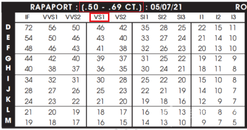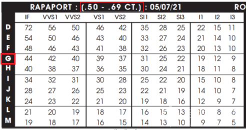 shouxianzhaodaozuixinyiqide《rapaportzuanshijiagebiao》(xiamianyi2021.5.7zheiyiqidebaojiaweili),bingquebaogaibiaogeshiyongdezuanshixingzhuang。