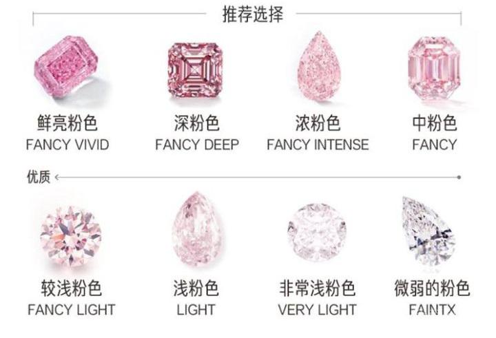 caizuanyansefenjiugejibie:faint〈wei〉、very light〈weiqian〉、light〈qian〉、fancy light〈dancai〉、fancy〈zhongcai〉、fancy dark〈ancai〉、fancy intense〈nongcai〉、fancy deep〈`shencai〉、fancy vivid〈yancai〉。