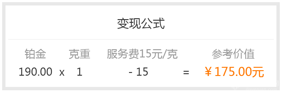 anzhaojinri190yuan/kedejiage,mouzhuanyehuishouwangzhandehuishoujiagewei:190(baijinkejia)x1(kezhong)- 15(fuwufei/ke)=¥175yuanyike。youyubaijinjiagemeitiandouhuigengxin,cihuishoujiagejingongcankao。