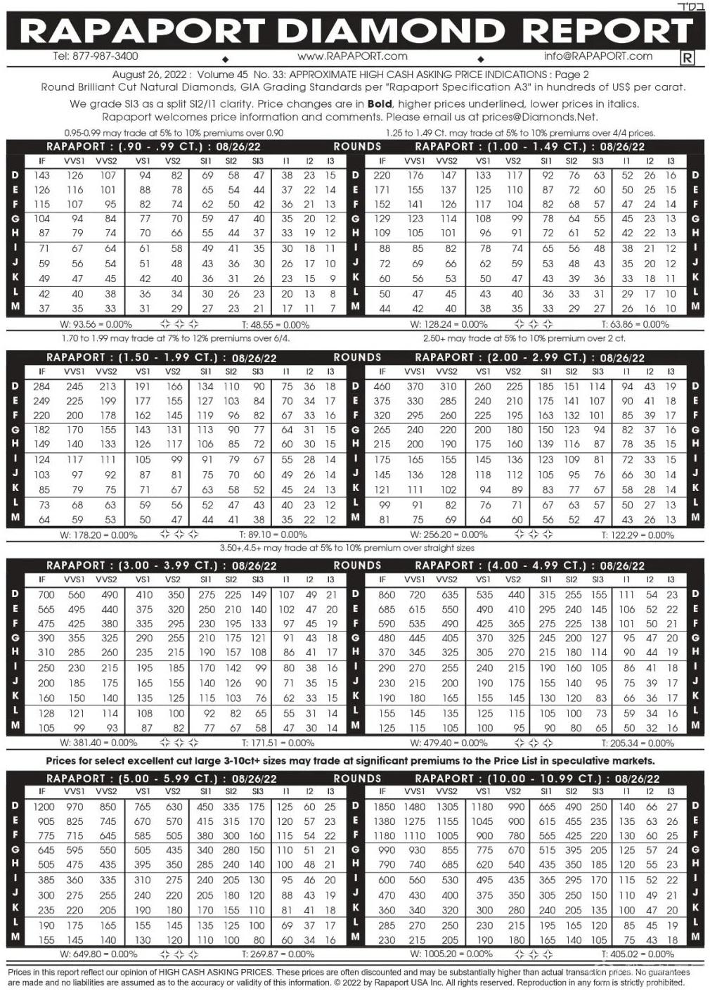 rapaportjituanshiyigekuaguogongsijituan,chuangbanyu1978niande《rapaportzuanshibaodao》shizuanshijiageheshichangxinxidezhongyaolaiyuan,《rapaportzuanshijiagebiao》(guoneisuchengwei《guojizuanshijiagebiao》) beiquanqiuzuanshiyerenshiyongzuobaojiajichu。