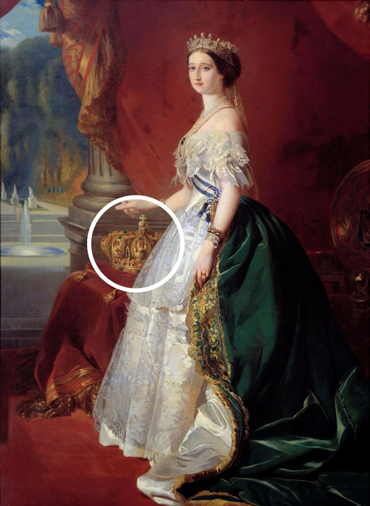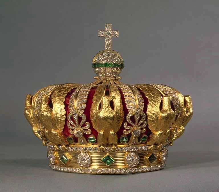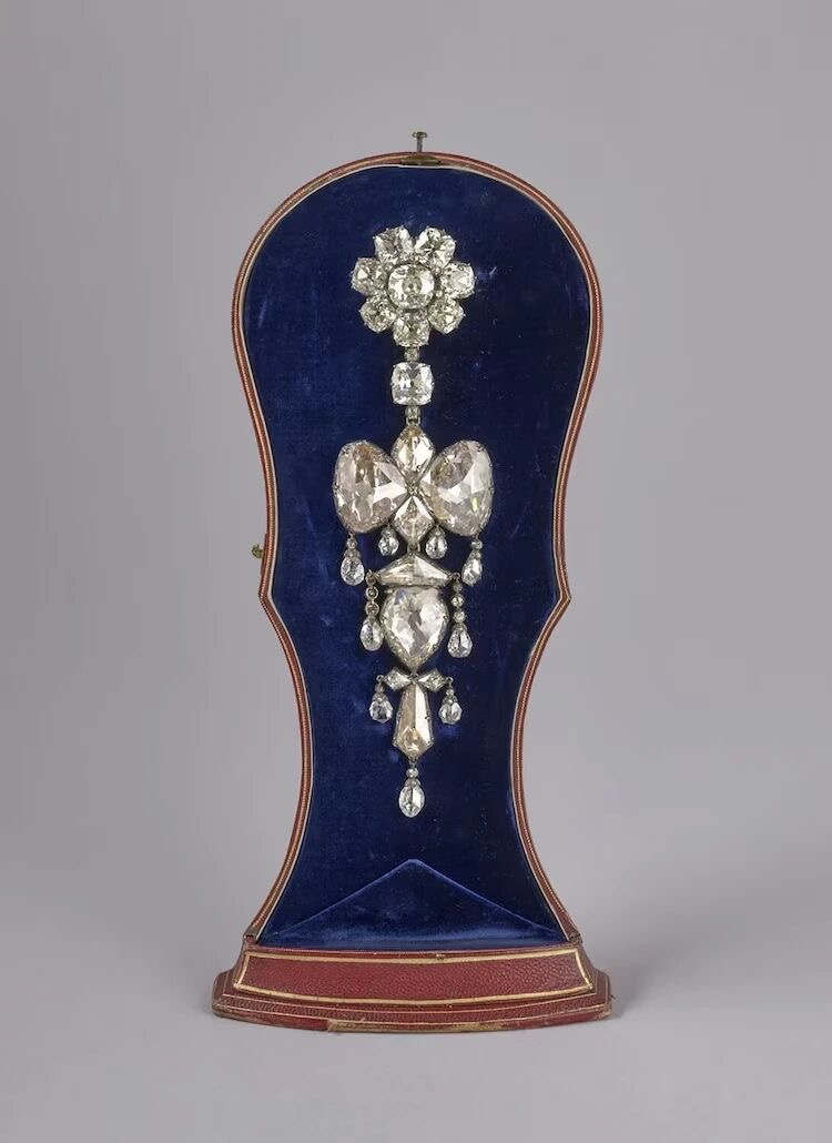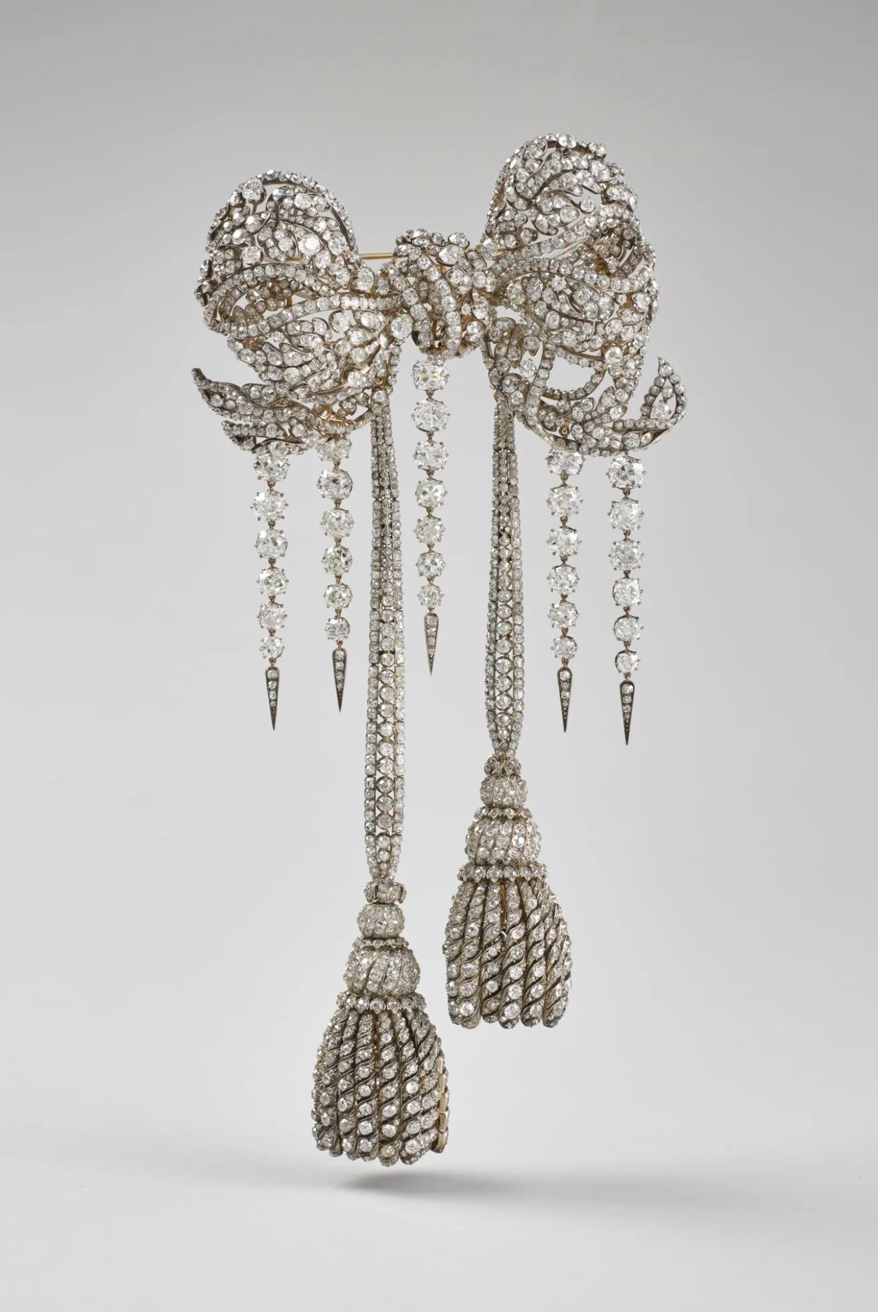 zheimeiourenniwanghoudezuanshixiongzhenzhizuoyu1855nian,suoyongbaoshijunquziwangshizhubao。qizhongzuiweizhenguideyaoshuxiongzhenzhongyangxingsihudiechibangdeliangkejuzuan,tamenyuanzimasalinzuanshixilie。