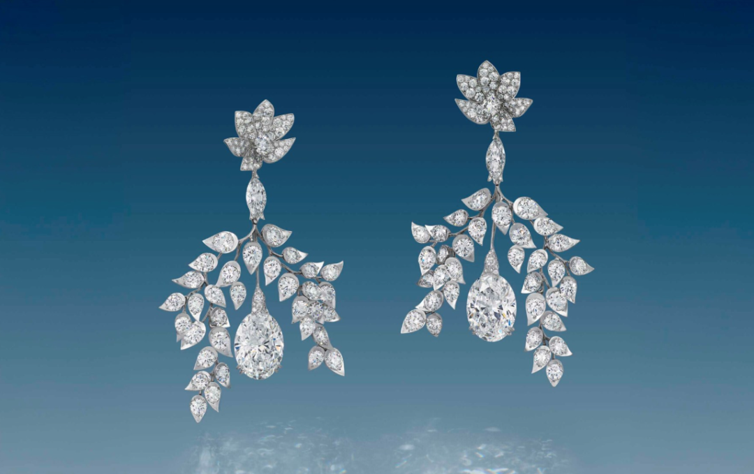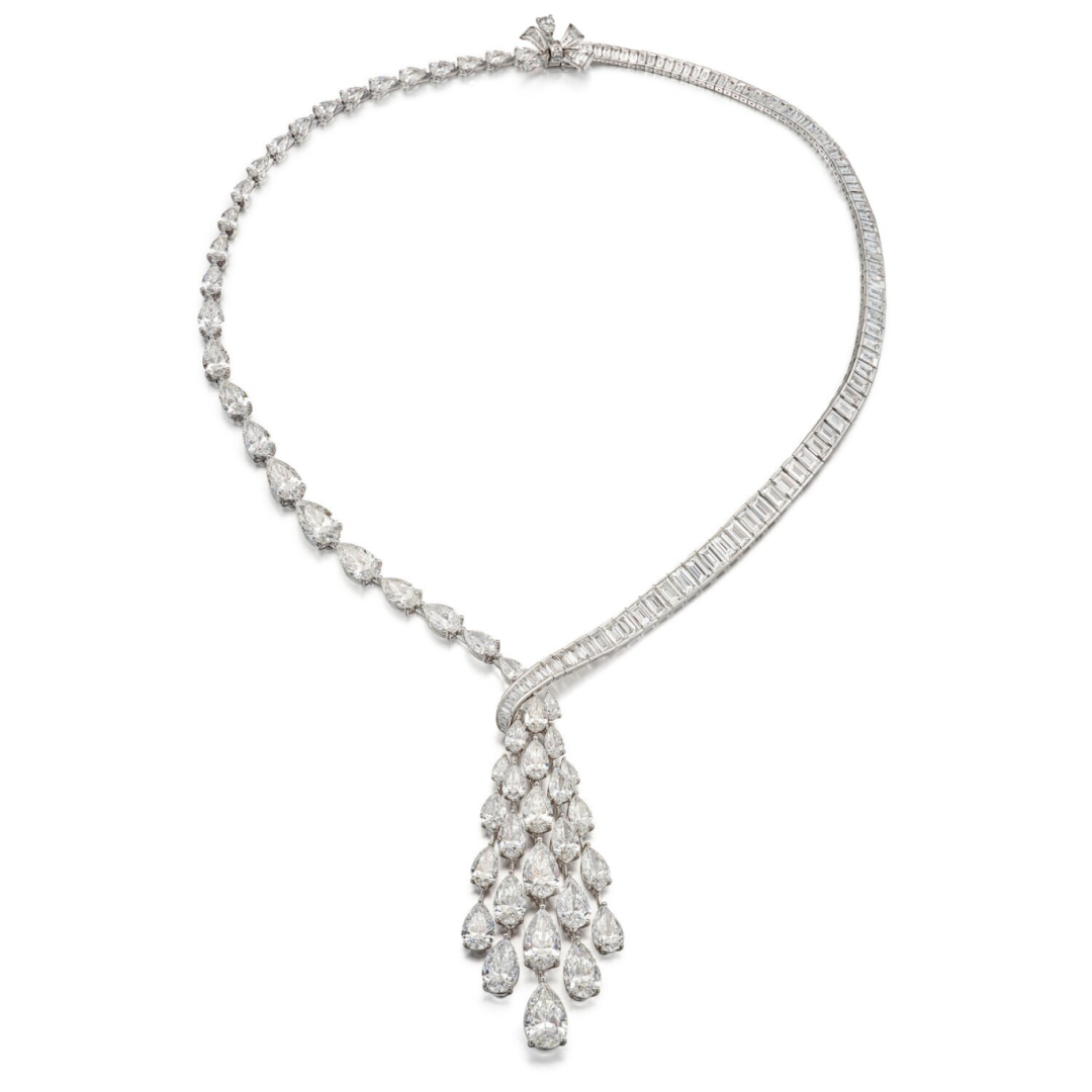 zheishibenchangpaimaichengjiaojiadisigaodepaipin。lianshencaiyongdaxiaojiancideshuidixinghezhangjietixingqiegezuanshilianzhuiercheng,yingzaochubuduichengmeigan,suoxuanzuanshizhongliangcong0.9ctzhi3.01ctbudeng。shuidixingliusuzaipeidaishihuichuiluozaixiongqian,suidongzuoqifuzhanfangguangcai。graffbiaozhixingdehudiejiezaoxingbeiyongyudakousheji,xiangqianwusezuanshigengxianjingzhi。