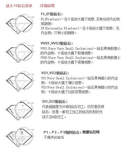 净度是指石钻的纯净度。净度包括两部分,即宝石内部原有的缺陷及加工过程中对钻石表面造成的瑕疵。对钻石来说,当然是越纯净越优质;但是净度是在十倍显微镜下才可以辨别,所以在购买时一定要根据钻石鉴定证书来辨别。