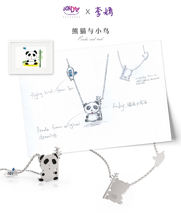 时尚亲子珠宝Ooh Dear正式推出携手嫣然天使基金共同打造的小熊猫项链,该款项链为李嫣同Ooh Dear珠宝设计师共同设计完成,其灵感来源于李嫣5岁时画作《熊猫与小鸟》,并以此命名。