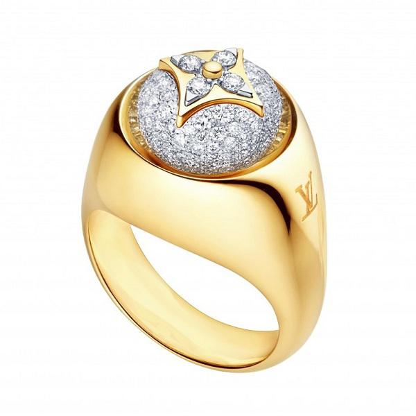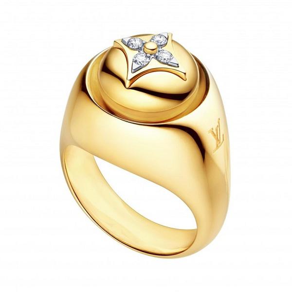lingyizujiezhimofanggudianfenggedeyinzhangjiezhi(signet ring)——jiebichengcuguangdekuanbianlunkuo,cemiankeyou monogram tutengzhongde“lv”biaozhi;jiemianzhongyangtuoqiyikehumianbaoshihuojinzhu,rutongfudongyujiemianzhishang,dingbudesijiaoxinghuawenchengweiyinrenzhuyidejiaodian。zheiyiqiaomiaodefudongjiegoutongyangyunyongyub. blossom shouzhuodeshejizhong。
