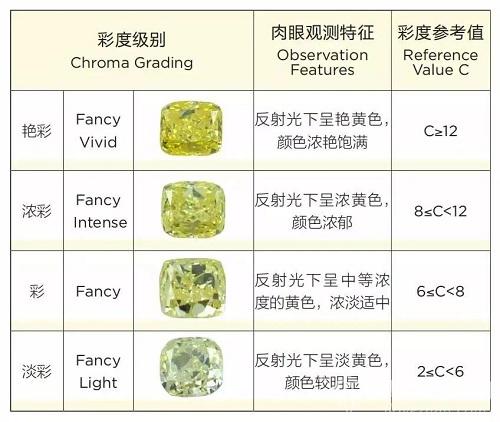 giacaizuanfenjixitongjianghuangsezuanshiyansehuafenweiliugedengji:fancy light yellow(dancai)、fancy yellow(cai)、fancy intense yellow(nongcai)、fancy vivid yellow(yancai)、fancy deep yellow(shencai)、fancy dark yellow(ancai)。tongsudelaishuo,huangzuandeyuemingyanyansedengjiyuegao。
