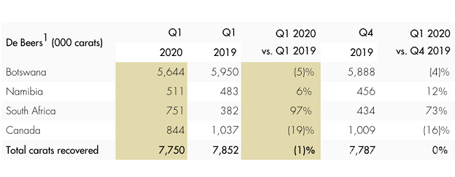 近期,戴比尔斯(De Beers)公布了今年第一季度的生产情况:一季度总产量基本与去年同期持、加拿大的产量大幅下降。受疫情影响,戴比尔斯也将今年总产量计划从原来的3200-3400万克拉下降至2500-2700万克拉。