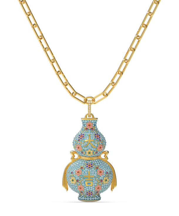 cixiandingkuanxiangliancongdajihuluhuapingdetuan,xijiehebiaozhixingdexingzhuangzhongjiqulinggan,caiyongleqingdaihulubaopingdefalanghuahuidenongyupeise,zhuiyouzumulv、qiancuilv、meiguise、qianhuangse、juhongse、diwanglansedengqingdaigongtingsexifangshuijing,yangyizhecuicanlingdongdegongtingxiangruizhiqi。xianglianxijieqianyoudaji,baoxianghuahechanzhiwenyang,yizhongguochuantonghuankouyangshixianglian,chuandishengshengbuxi,qifunaxiangzhiyi。