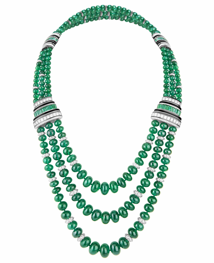 zheikuanlingrenyanqianyiliangdezhubaozuopinshejilingganyuanziboucheronbaoshilongweiyindudajunpaidiyala(maharajah of patiala)tebiedingzhidexianglian,xianglianxiangqian220kezumulv,zongzhongda1071.97kela。dangshi,nanxingpeidaigaojizhubaobeishiweiyongyouquanliherongyudexiangzheng。shejizongjianclaire choisnejiangzheizhongchuncuideliliangyuzhiganrouhedezumulvxiangjiehe,xianliyudangdainvxing。