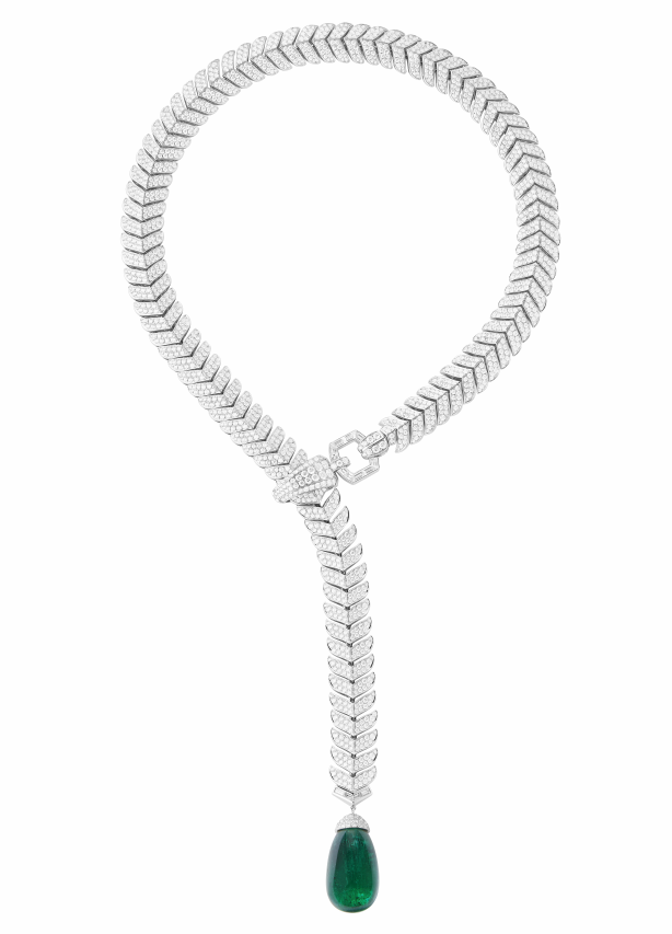 chevron émeraudexianglianzhengtirutongzhiwumianliaobanyoumeiliuchang。claire choisnegenjushangshiji20niandaishijiazhongaiderenziwenxiantiaoshejileyikuanpuxiangzuanshidederuanbaijinxianglian,tongshichuizhuiyike61.36kelazumulvdiaozhui。zheikuanzuopinzaishejishidadandijiangkouhuanbufenrongheyuzhuangshideyibufen,kouhuanbenshenjiweiyikezhubao,yikezuoweiliuchanghuadongdelingjie,jiangxiangliandiaozhengzhiwanmeidezhangdu。