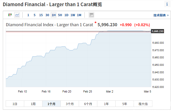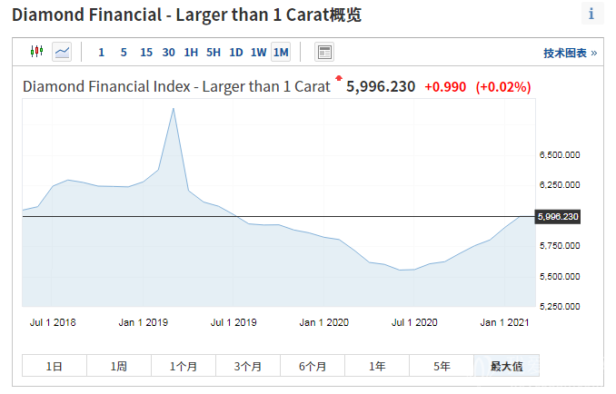 2021nian2yue,1kelayishangzuanshijiagejiagezhishu(larger than 1 carat)kaipan5,905.47,jiezhi2yue28ri,shoupan5,996.00,shangzhang1.53%,jinnianyileijishangzhang3.36%。