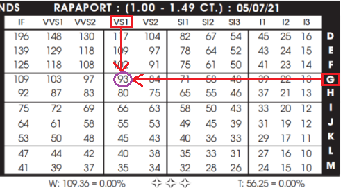 zhaochuduiyingzuanshizhongliangde<yansecolor(zhilan)>、<jingdu(henglan)>,lingbiaogezhongdedanjiax100 xzhongliangxmeiyuanhuilv,jikedechuzheherenminbidezuanshijiage。