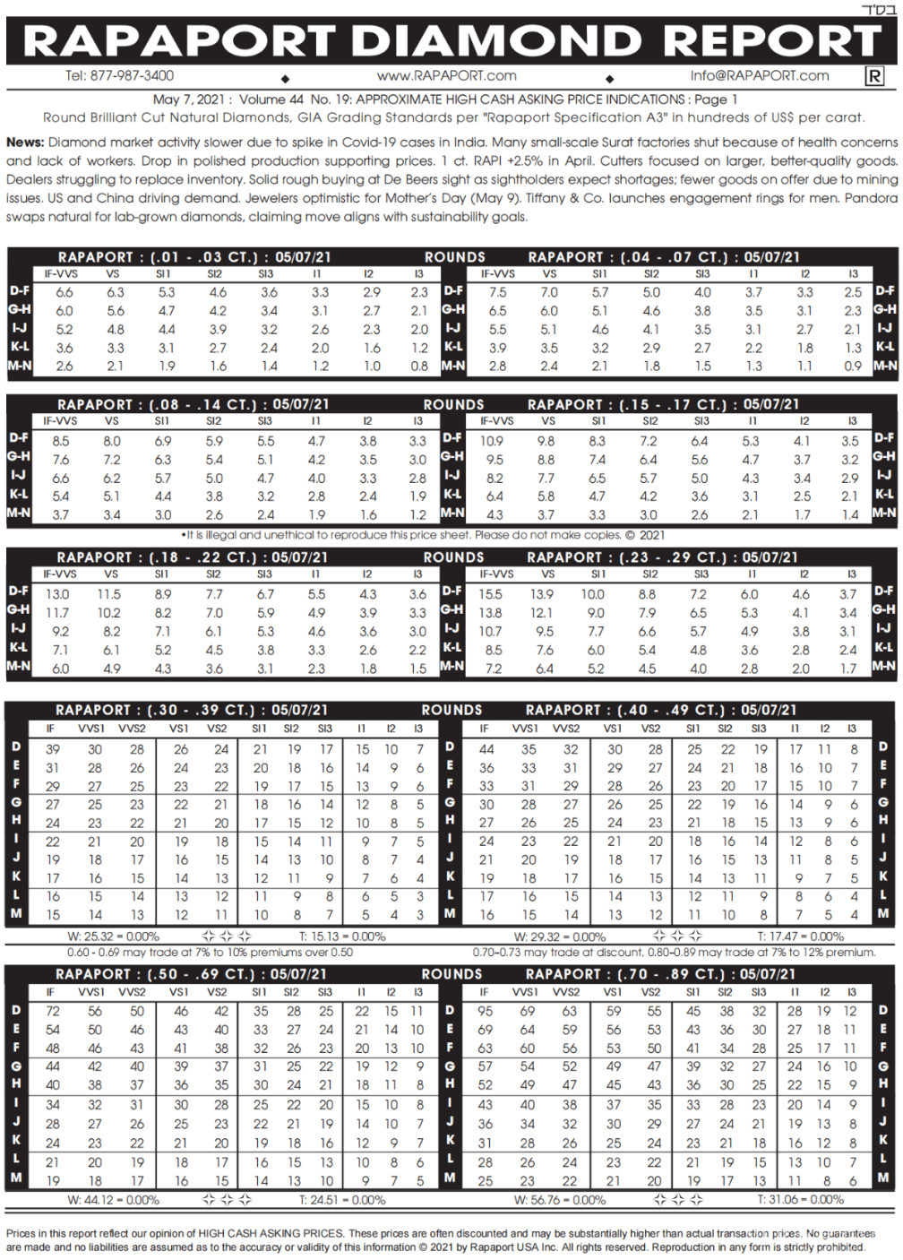 rapaport国际钻石价格表是供业内人士参考的钻石进货价,随着钻石行业越来越透明化,许多消费者也关注到这个信息,那么怎么看rapaport国际钻石价格表?rapaport钻石报价表靠谱吗?