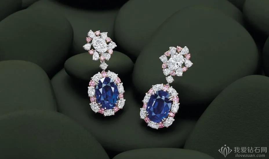 两颗椭圆形蓝宝石各重11.34及9.88克拉,均产自缅甸,呈“皇家蓝”色,未经加热优化,配镶椭圆形钻石及粉色调钻石。