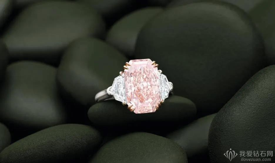 切角矩形彩橘粉钻重约5.02克拉,色彩天然、VVS1净度,两边配镶钻石。
