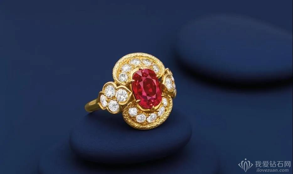 椭圆形红宝石重约3.21克拉,产自缅甸,呈“鸽血红”色,未经加热优化,配镶钻石。