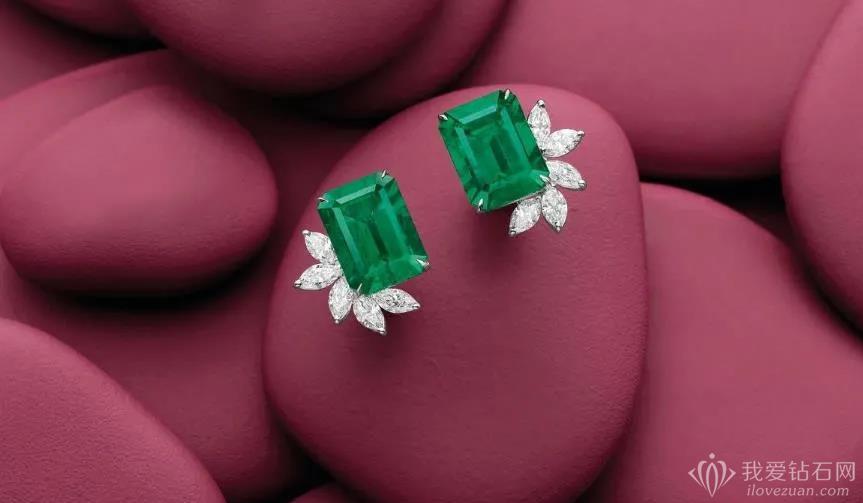 两颗八角形阶梯型切割祖母绿各重5.43及5.26克拉,均产自哥伦比亚,未经净度优化,配镶马眼形钻石。