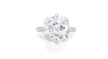 枕形钻石重约9.34克拉,F色、VVS1净度,配镶圆形明亮式切割钻石。