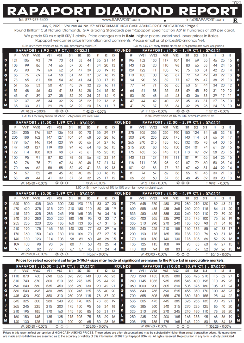 Rapaport钻石报价表(简称国际钻石报价表)是钻石批发商交易钻石时的重要价格依据,为钻石商家提供有效的国际钻石价格参考,消费者可根据报告全面了解最新钻石价格。下面分享2021年7月2日最新Rapaport国际钻石价格表图文介绍。