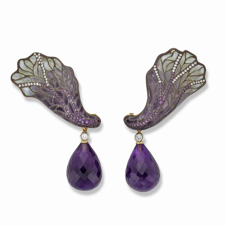 zuiyinrenzhuyideshiyiduileaferhuan,youputaoyashejishi jose manuel rosas sheji——erhuanyiyeziweizhuti,yunyongduheijinzhisuzaochuxianzhangwanzhuandeyebanxingtai,biaomianpuchenjin5ctdecaiselanbaoshihe1.29ctzumulv,guililingdongdebaoshisecaiyingzaochuziranshengmingli。