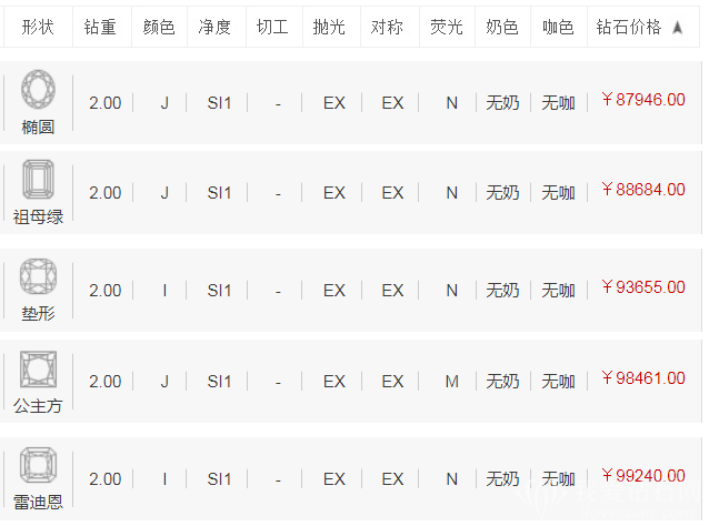 下面是最新的2克拉钻石价格表: