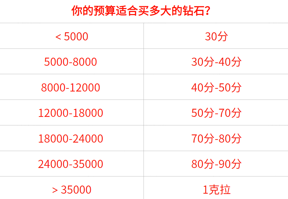 可以根据刚刚确定的预算,对照下面这张表格来看看自己适合选择多大的钻石: