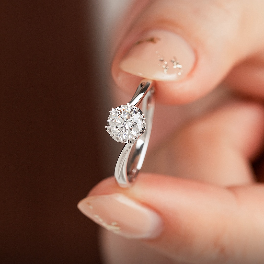 主钻+素金戒托的经典组合,看起来极简又高级,可以尽情展现主钻的闪耀与纯粹美感。如果你的钻石品质很高,或者克拉数很大很抢眼,完全可以选择不加配钻。