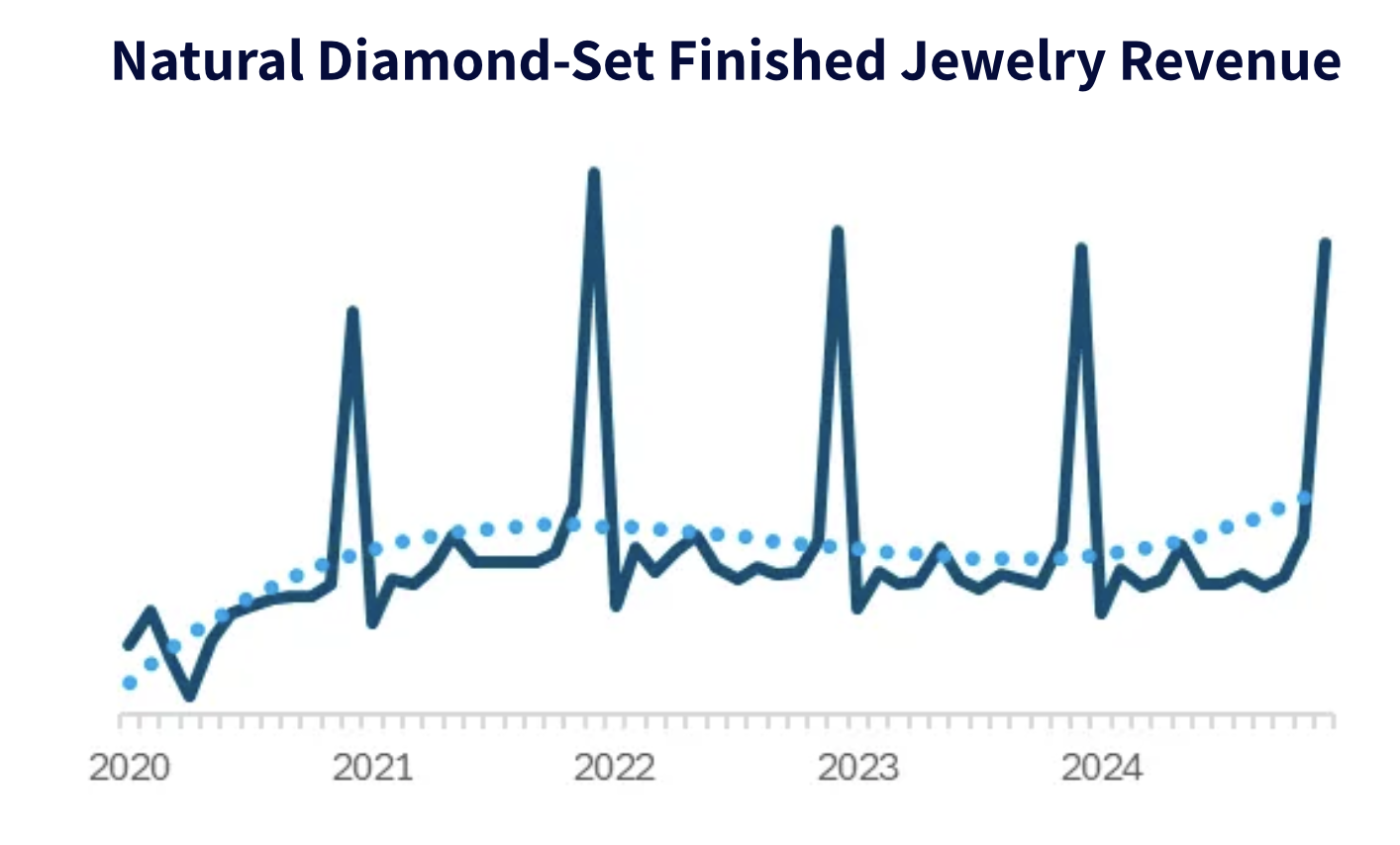 从整体上看,2024年美国裸石零售总额下降了 5%,并且在全年都体现了一定的承压。