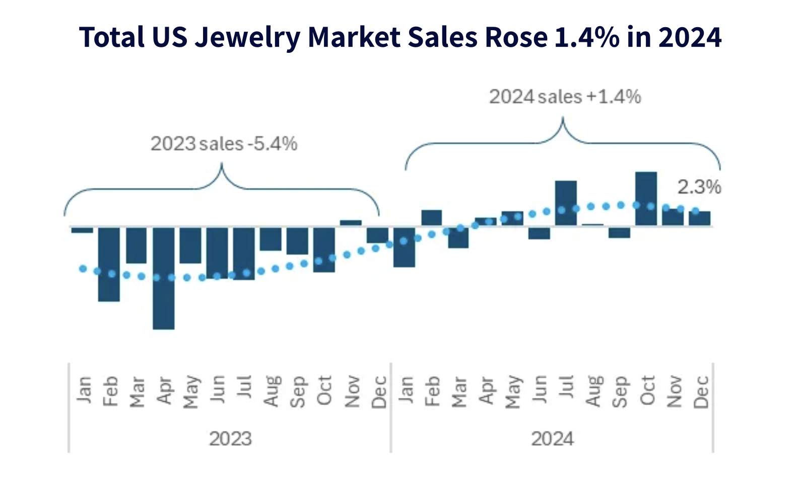 珠宝成品市场2024年美国珠宝成品市场的零售额增幅为 +2.9%,优于2023年的 -3.4%,与该国的GDP“基本保持一致”(待考证)。这是一个较为积极的表现。