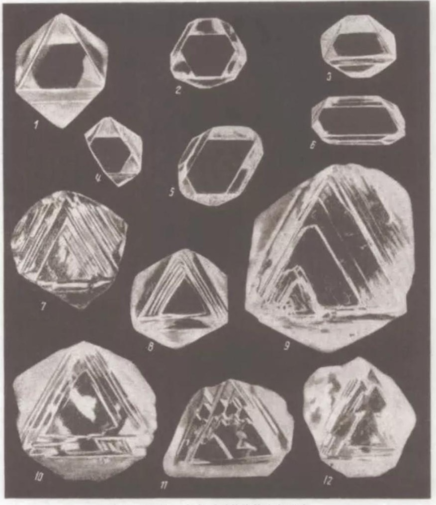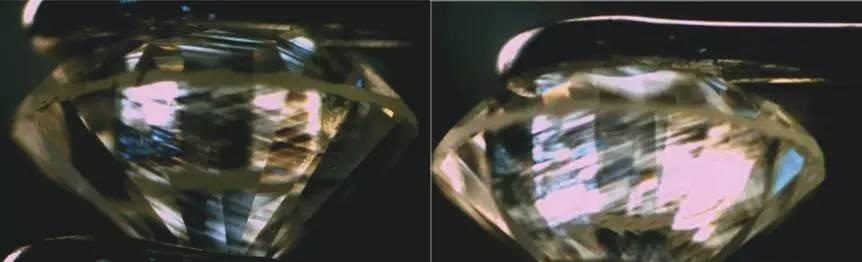 其次,天然钻石主要呈现八面体、立方体、菱形十二面体的单形,或者尖晶石律双晶。合成HPHT钻石主要形成八面体与立方体聚形,内部应力不均,导致异常消光。