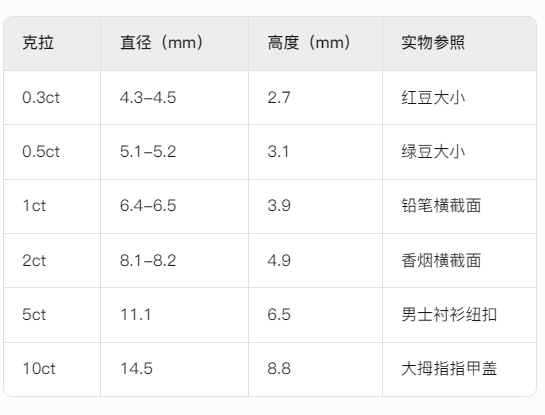 钻石的“克拉”(Carat)是国际通用的重量单位,1克拉=0.2克。但钻石尺寸(直径×高度)不仅与克拉相关,还受切割工艺影响。以下为常见克拉对应的近似尺寸(标准圆钻):