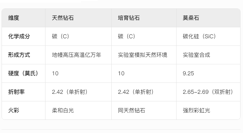 培育钻石和天然钻石、莫桑石在外观上都比较相似,放在一起很容易混淆,下面是三者的区别: