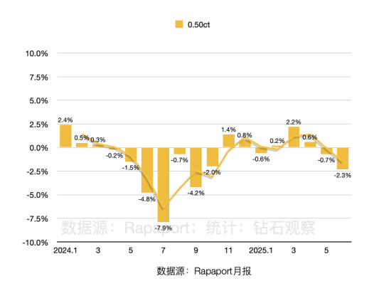 综合观察自2024年1月至2025年6月的各板块价格变化情况(如下图),可以看到天然钻石价格在经历了数月的涨势之后已经出现反转,其中0.50克拉的表现最为明显。