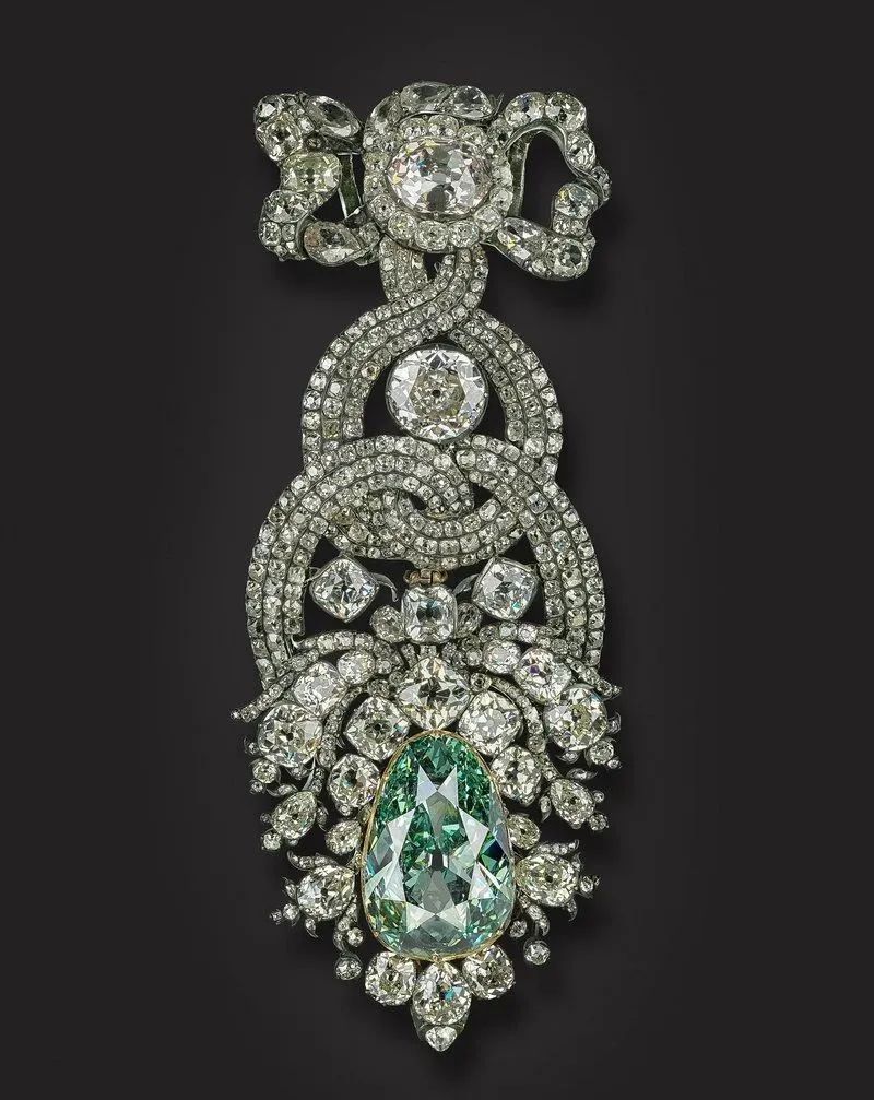 这颗奥尔洛夫钻石重189.62克拉,大约17世纪中叶发现于于印度,带有微妙的绿色和蓝色色调,后被镶嵌在俄国叶卡捷琳娜大帝统治时期制造的帝国权杖上。