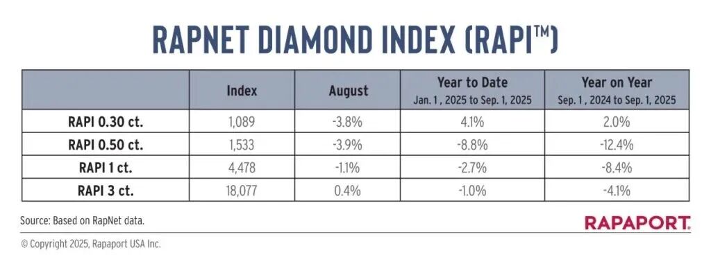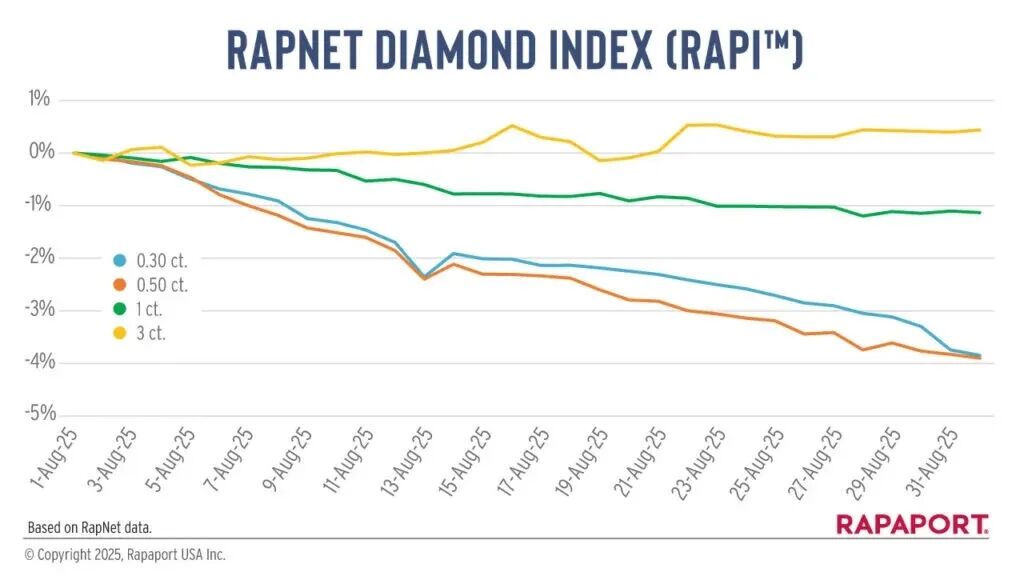 据 Rapaport 今天发布的2025年8月天然钻石裸钻价格报告显示,钻石价格再一次出现下降,其中圆形钻石降价明显,而异形钻石的价格相对稳定。