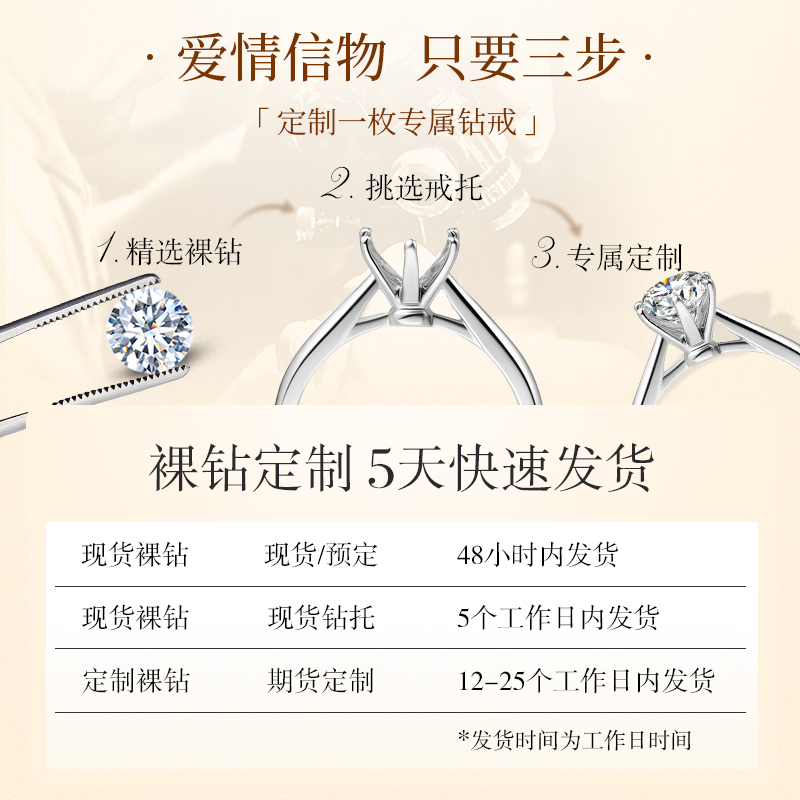 商品点评:宝贝收到了,与卖家描述的完全一致,很喜欢,这款很显钻,戴上还很手白,包装里还有证书,发货速度非常快,满意