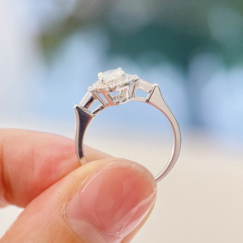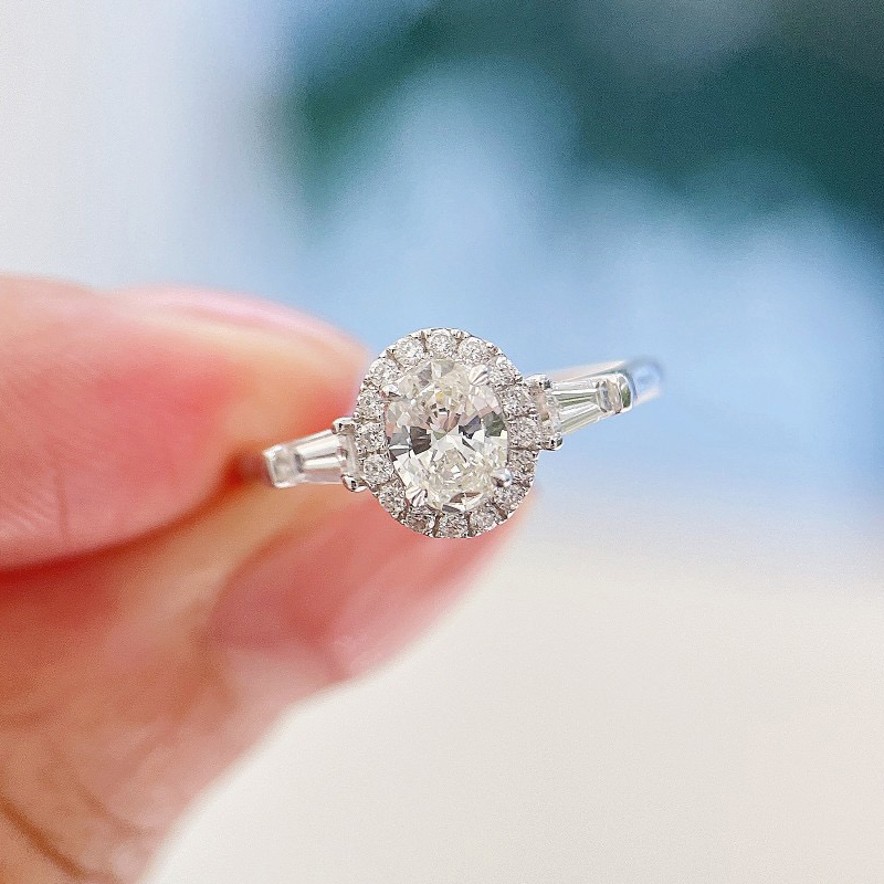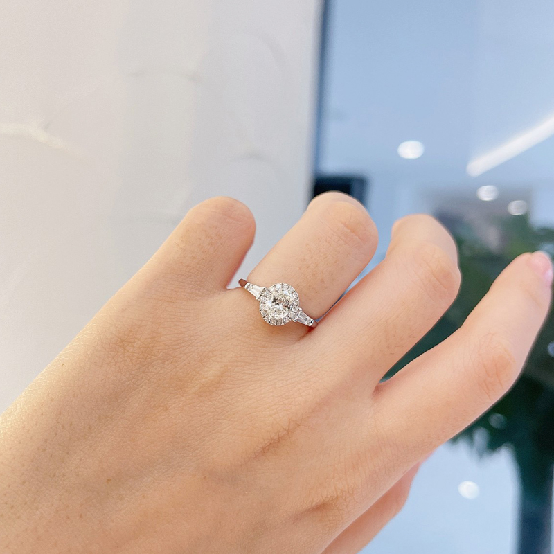 首页>异形钻戒>椭圆形 单圈围镶戒臂梯方副钻 18K金钻戒